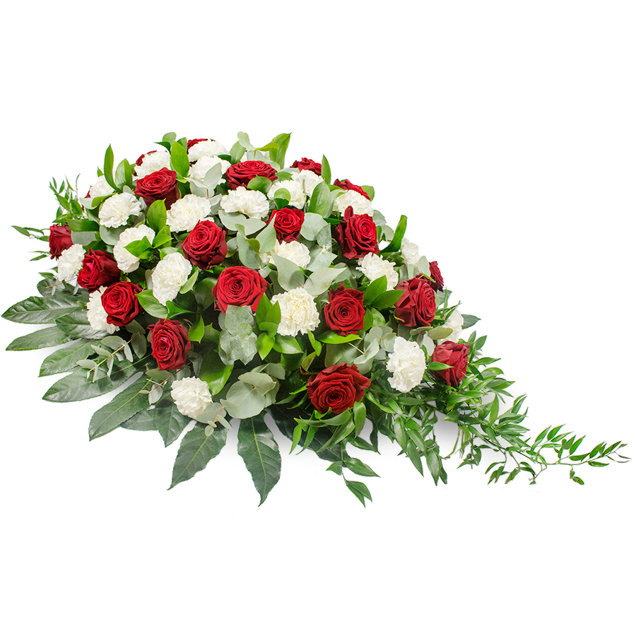 Express your heartfelt condolences with our Peaceful Remembrance Bouquet. This beautiful arrangement features a harmonious blend of red roses, white carnations, and vibrant greenery, thoughtfully designed to honor and remember your loved one.