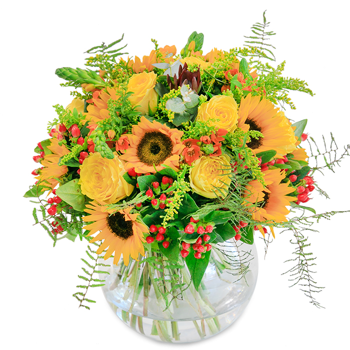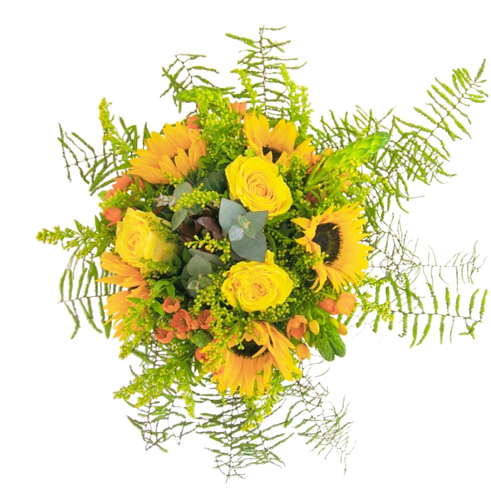 Immerse yourself in the serenity of nature with our luxurious bouquet, artfully composed to bring joy and elegance to any space. This arrangement features a vibrant medley of sunflowers, yellow roses, red hypericum, and other exceptional blooms, all hand-selected for their unparalleled freshness and beauty. Crafted with passion and precision, every stem tells a story of quality and timeless appeal.