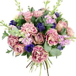 Our Charming Floral Delight combines vibrant colors with a unique selection of blue hydrangeas, light purple roses, green lisianthus, white spray roses, Ammi visnaga, pink bouvardia, and pink astilbe to create a visually captivating arrangement.